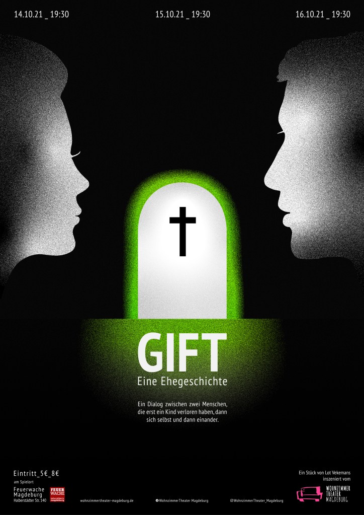 „Wir sind ein Mann und eine Frau, die ein Kind verloren haben. Ich möchte sagen, die erst ein Kind verloren haben, dann sich selbst und dann einander“. Mit diesen Worten beschreibt ER die gemeinsame Geschichte der beiden Figuren im Stück „GIFT – Eine Ehegeschichte“. Nach neun Jahren treffen sich ER und SIE auf dem Friedhof am Grab ihres verstorbenen vierjährigen Sohnes wieder. Besondere Umstände zwingen sie dazu, denn Giftstoffe sickern in den Boden und die Gräber müssen verlegt werden. Die zwei Charaktere setzen sich mit dem Tod des Kindes, dem Zerfall der Beziehung und dem Umgang mit dem Verlust auseinander. Wie kann man weiterleben, wenn man solches Leid erfahren hat? Beide haben darauf ihre eigene Antwort gefunden.