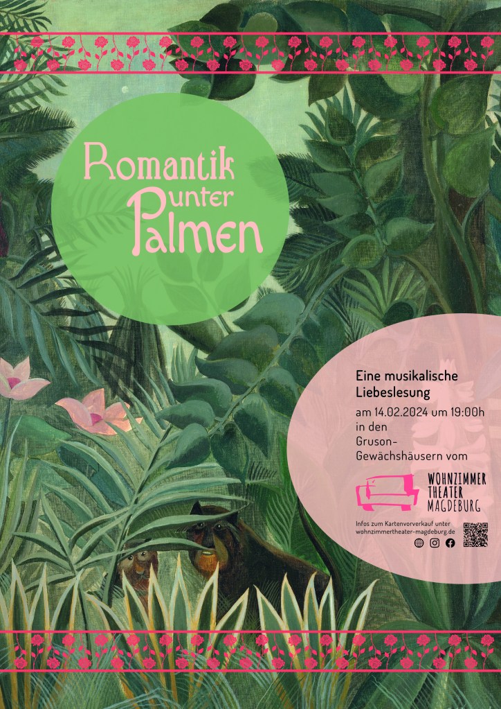 Am Valentinstag nimmt das „Wohnzimmertheater Magdeburg“ alle Liebenden und Geliebten mit auf eine musikalische Reise durch Jahrhunderte der Liebeslyrik. Durch Musik untermalt, mit einem Prosecco in der Hand und liebevoll gebackenen Cupcakes zwischen den Zähnen, könnte die Atmosphäre zwischen Farnen und unter Palmen in den Gruson Gewächshäusern in Magdeburg nicht sinnlicher sein, um den poetischen Texten der Liebe zu lauschen.